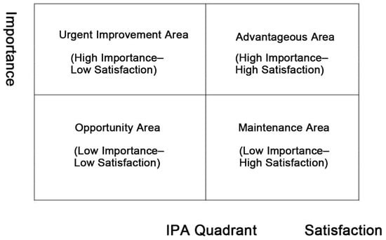 Importance–Performance Analysis (IPA) guides decision making by measuring and evaluating two dimensions: importance (I), which measures the level of consumer expectation for a particular indicator; and effectiveness or satisfaction (P), which measures the actual performance of the indicator or the consumers’ actual feelings. As a simple but effective research method, IPA prioritizes service quality improvements by comparing the difference between the importance of each indicator and its actual performance, thereby optimizing the allocation of limited resources. It is highly scientific, reasonable, and practical. This paper uses IPA to explore the optimization of rural public service facilities. Using importance as the vertical axis, satisfaction as the horizontal axis, and the intersection of the mean of these two aspects as the origin, the analysis results are divided into four quadrants (Figure 3).