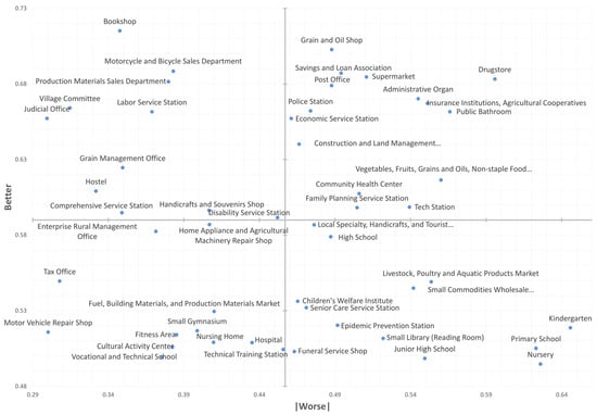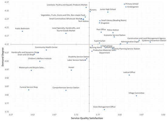 This study plots a better–worse coefficient chart (Figure 4), based on the better and worse values for each facility detailed in Appendix D. The abscissa of the better–worse coefficient chart is the absolute value of the worse values and the ordinate is the absolute value of the better values, which can be used to visually display the attributes of all the facilities. The first quadrant represents one-dimensional demand. Most items corresponding to healthcare, welfare, and market facilities are located in this quadrant, as are some items corresponding to commercial and financial facilities. This indicates that rural residents want to enjoy the services provided by the corresponding facilities in their daily lives, portray a high level of demand for them, and place a high priority on their construction and renewal. The second quadrant represents attractive demand. Some items corresponding to commercial and financial facilities are located in this quadrant, indicating that these types of facilities can improve the quality of life of rural residents, are in medium demand, and the priority in terms of construction and renewal is medium. The third quadrant represents indifferent demand, and most of the projects involving cultural, sports, and technology facilities are located in this quadrant, which indicates that in regard to the current rural development situation, residents do not care about this type of facility in terms of their daily lives and do not portray a high demand for them. The priority in terms of construction and renewal is the lowest for this quadrant. The fourth quadrant represents must-be demand, and most of the projects involving educational institution facilities are located in this quadrant, which indicates that rural residents cannot do without this type of facility in their daily lives and there is very high demand for them. In terms of the facility provision priorities, the general order is must-be demand > one-dimensional demand > attractive demand > indifferent demand.
