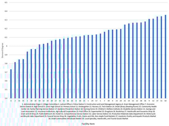The facility items remaining after the secondary screening are sorted according to the degree of demand, as shown in Figure 5, and the facility numbering is shown in Appendix E. The facilities with the highest demand are primary schools and kindergartens, followed by livestock and poultry, aquatic product markets, and nurseries; the facilities with the lowest demand are grain management offices, village committees, and comprehensive service stations. Classifying and summarizing by facility type, the overall importance of educational institution facilities is the highest, indicating that rural residents cannot do without this type of facility in their daily lives, and that the demand for them is extremely high, showing the highest priority in terms of their construction and renewal. The overall importance of healthcare facilities, welfare facilities, and market facilities is relatively high, indicating that rural residents want to enjoy the services provided by the corresponding facilities in their daily lives, and that the demand for them is relatively high, with a relatively high priority in terms of their construction and renewal.
