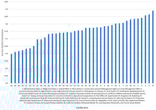 The satisfaction with public service facilities after the secondary screening is ranked in order of value, as shown in Figure 6, and the facility numbering is shown in Appendix E. The highest satisfaction is with the epidemic prevention station, construction and land management agencies, village committees, and judicial offices; the lowest satisfaction is with public bathrooms, funeral service shops, and motorcycle and bicycle sales departments. Summarized by the type of facility, the overall satisfaction of rural residents with the quality of public service facilities is at a medium-to-high level, and there is still lots of room for improvement. The overall satisfaction with administrative facilities and educational institution facilities is relatively high, while the overall satisfaction with commercial and financial facilities and market facilities is relatively low. Consequently, specific construction and upgrading strategies need to be proposed in combination with facility demand.