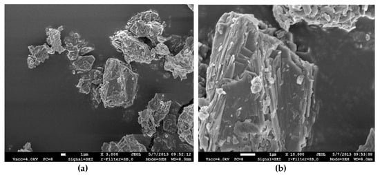 NPA SEM images are presented in Figure 2a at ×3000 magnification and in Figure 2b at ×10,000 magnification. As shown in the images, NPA particles have a plate shape and a size of 10 µm. Agglomerations of smaller particles are also visible.