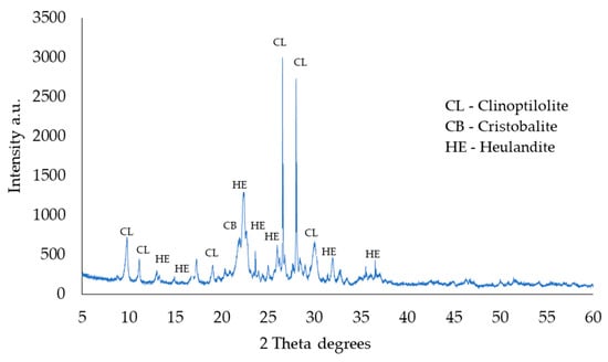 X-ray diffraction analysis (XRD) of the NPA (Figure 3) reveals that this material is composed of three main minerals: clinoptilolite, heulandite, and cristobalite.