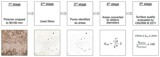 The specific surface area of NPA was measured using the air permeability method (Blaine method) according to LST EN 196-6:2010 [50]. Particle size distribution was determined using a Cilas 1090 LD particle size analyser (U.S. Philadelphia, Horsham). Water was used as the dispersion phase, the solid content of the suspension ranged between 12% and 14%, the ultrasonic particle dispersion lasted 100 s, and particle size was measured in the range of 0.01 to 500 μm in 15 s intervals. The qualitative analysis of mineral material phase composition was performed with an X-ray diffractometer. A graphite monochromator was employed to obtain the X-ray Cu Kα spectrum (λ = 0.154184 nm). The test parameters were set as follows: anode voltage at 30 kV, anode current at 12 mA, diffraction angle (2θ) ranging from 5° to 60°, detector step size of 0.02°, and an intensity measurement time of 0.5 s per step. PDXL software (Rigaku Corporation, Japan, Tokyo) and the PDF-4+ database of crystal structures was used for XRD analysis. Pictures of concrete specimens were processed and analysed using the image processing programmes ACDSee and ImageJ according to the methodology presented in Figure 4.