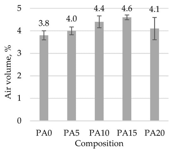 We measured entrained air content in the concrete mixture (Figure 5). Reference specimen PA0 had an entrained air content of 3.8%. Entrained air content increased with the replacement of PC with NPA. In specimens modified with 5% NPA, the entrained air content increased slightly to 4.0%. The value of entrained air increased to 4.4% in specimens modified with 10% NPA. The highest entrained air value of 4.6% was reached in the samples containing 15% NPA. With a further increase in NPA content to 20%, the entrained air content dropped to 4.1%.