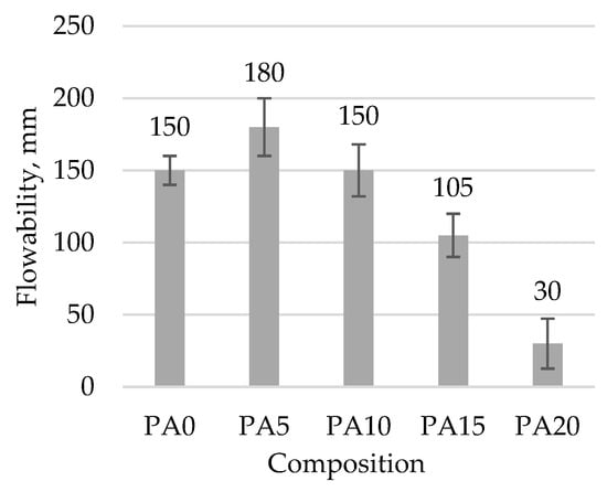 Xu et al. analysed the effect of NPA on mortar flowability. They reported that mortar flowability increased when 5% or 10% PC was replaced with NPA. The authors explained this effect by a higher degree of cohesiveness in the mix depending on NPA particle size and amount. With the packing density of composite structure thus improved, there is more excess water in the system, and the flowability of the mixture improves [58].