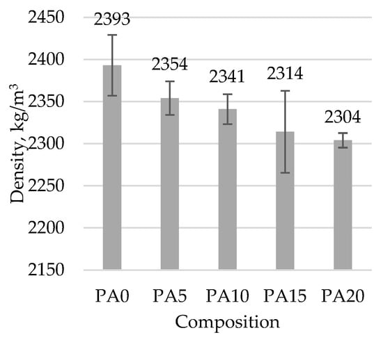 Figure 7 illustrates the relationship between the cast concrete density and NPA content. The density of the reference composition shown in the figure is 2393 kg/m3. When the binder is replaced with 5% NPA, the density drops to 2354 kg/m3. The same downward trend is observed with an increase in NPA content.