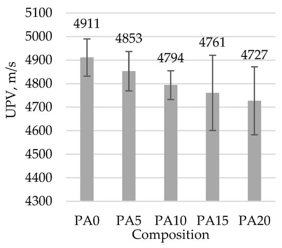 The observed decrease in density values is natural considering that NPA has a lower specific density than PC. The dependence of UPV on the content of NPA added to concrete mixtures correlates with density values. Figure 8 illustrates the results of UPV tests. The UPV value in reference specimens is 4911 m/s. A higher NPA content causes UPV values to decrease to 4727 m/s in specimens modified with 20% NPA.
