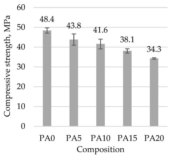 Figure 9 illustrates the dependence of compressive strength on NPA content after 7 days of curing. The reference specimen has a compressive strength of 48.4 MPa. When 5% of the binder is replaced with NPA, the compressive strength of concrete drops by 9.5%. Bigger amounts of NPA decrease the compressive strength values even more: concrete modified with 10% NPA has a compressive strength of 41.6 MPa, 38.1 MPa with 15% NPA, and 34.3 MPa with 20% NPA.