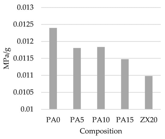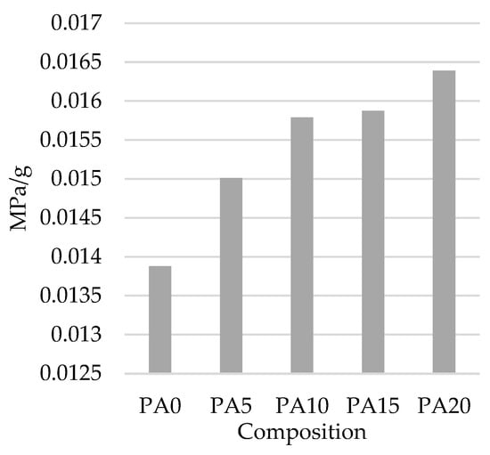 To better understand the effect of the NPA on the properties analysed, the test data were adjusted, i.e., recalculated to express the compressive strength achieved per unit weight of PC. This recalculation method helps to eliminate the effect of PC “dilution” and reveal the relative effectiveness of NPA on mechanical properties.