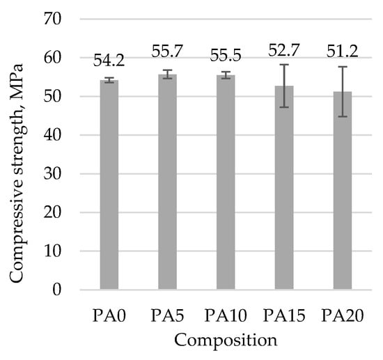 In a study where 0%, 5%, and 10% of the PC was replaced with NPA, it was found that after 28 days, the NPA-modified specimens exhibited compressive strength values 10.4% and 12.6% higher, respectively, than those of the reference [41]. Another study analysed the effect of varying NPA content (0%, 10%, 15%, 20%) and curing times (1, 7, and 28 days) on compressive strength. The results showed that all NPA-modified specimens outperformed the reference specimens at all curing times, with the highest compressive strength observed in the specimens modified with 20% NPA at 28 days [62].