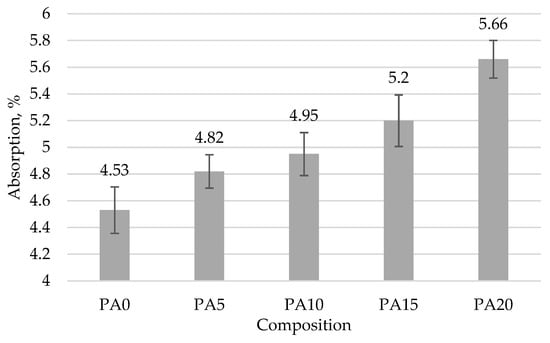 Figure 13 illustrates the relationship between NPA content and water absorption in concrete. The tests showed that water absorption increases with the NPA content in concrete. These findings corroborate density test results, which showed that density decreases with a higher NPA content. Concrete containing 5% NPA had 6.4% higher water absorption. Water absorption increases with a higher NPA content. Concrete modified with 20% NPA has a water absorption value of 5.66%, which is 24.94% higher than that of the reference composition.