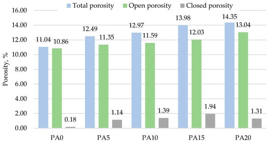 Concrete porosity test results are presented in Figure 14. The total porosity of concretes of different compositions modified with up to 20% NPA added at 5% increments was analysed. Reference specimens had a total porosity of 11.04%, open porosity of 10.86%, and closed porosity of 0.18%. The air-entraining admixture was intentionally not used to see the direct effect of NPA on concrete porosity. With the replacement of PC with 5% NPA, the total porosity increased by 13.13% up to 12.49%. It should be noted that open porosity also increased to 11.35% and closed porosity increased significantly to 1.14%. Closed porosity is a very strong indicator of the durability properties of concrete products. Similar trends were observed in the specimens modified with 10–15% NPA, as open and closed porosity values increased along with total porosity. The closed porosity decreased in the specimens with a higher NPA content of 20%, although the total porosity increased. The porosity tests suggest that 15% is the optimum/maximum amount of NPA that can be added by weight of PC to produce durable concrete.