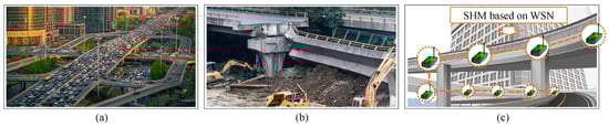 Urban viaducts are prevalent in large cities with (a) large amounts of traffic, and their (b) collapse can cause serious casualties. (c) SHM based on wireless sensor networks (WSNs) can help monitor the health condition of these urban viaducts.