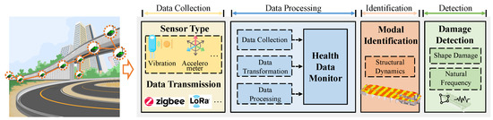 - We present a general wireless sensor approach (see Figure 2) for SHM in urban viaducts as a framework and further provide a full-chain review of the fundamental sensor types and wireless protocols for sensor data transmission, as well as the data processing, modal identification, and damage detection methods.