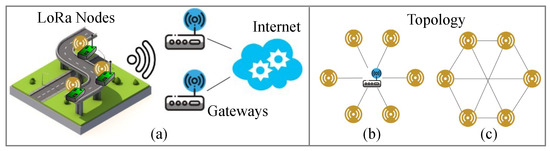 The data transmission structure of (a) LoRa-based SHM, with (b) star topology and (c) mesh topology.