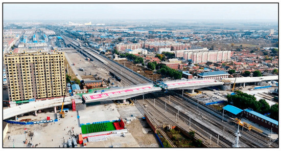 The project spans the throat area of Dehui Station, with a total length of 1140 m. As the bridge spans nine railway lines, including the main line of Beijing–Harbin Railway, construction is difficult. In view of the special working conditions of the adjacent existing railway line construction, in order to ensure the safety of the operating line and effectively control the structural deformation, the project innovatively adopts the horizontal rotation method construction technology to implement the cross-line operation. The main structure is designed as a three-span prestressed concrete continuous box girder system (span arrangement 60 + 100 + 60 m). Figure 1 shows the actual layout of the bridge swivel construction site. The middle two joint positions are the swivel bridge cap parts. It can be seen that there are complex equipment installation and narrow construction space on the site, which provides a real basis for the implementation of subsequent temperature control measures.