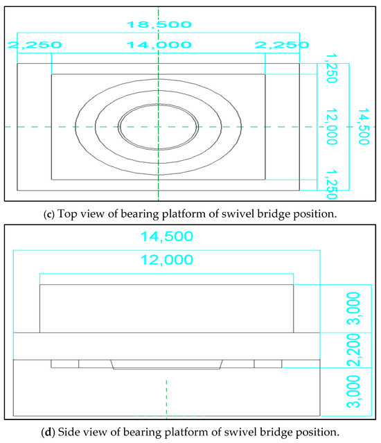 In this study, a BIM model is used to model the bridge and related infrastructure in three dimensions. The BIM model not only improves the accuracy of geometric modeling, but also can effectively deal with the details of the rotating system and complex installation areas (such as equipment, cooling water pipe layout), which provides an accurate and complete geometric basis for subsequent finite element analysis. Figure 2 shows the BIM three-dimensional visualization model of bridge engineering, in which Figure 2a is the overall three-dimensional structure view, which clearly shows the main structure of the bridge and the arrangement position of the cooling pipe. Figure 2b shows the three-dimensional view, front view and top view of the bearing platform of the bridge swivel part, which focuses on the structure of the swivel system and the complex components of the foundation, and provides a reference for the grid division and boundary condition setting of the subsequent finite element model.