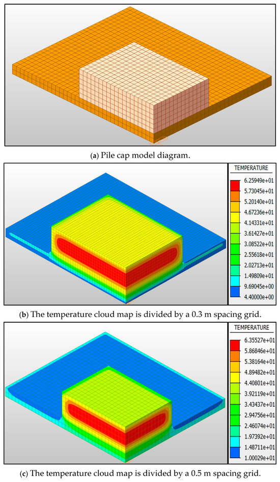 In order to ensure the accuracy of the analysis, we constructed a whole model including the cap and the foundation, and the foundation size is 36 m × 30 m × 1 m. Because the cap structure of this project is a regular rectangle, a 1/4 cap (9.25 m × 7.25 m × 3 m) is established for finite element model analysis. At the same time, in order to verify the rationality of the grid size selection, we carried out a grid sensitivity test, and set the model grid size to 0.3 m and 0.5 m, respectively. The temperature cloud diagram is shown in Figure 3b,c. After comparison, it is found that the difference between the maximum temperature peaks under the two grids is less than 0.015%, which proves that the 0.5 m grid is sufficient to capture the main gradient changes of the temperature field. In addition, the measured temperature of the project site is adopted for the ambient temperature of the project, and the actual temperature measurement and simulation comparison of the convection coefficient and thermal conductivity will be carried out to ensure the accuracy of the model. The mesh size is set to 0.5 m, and the hydration heat model of the whole cap contains 5241 nodes and 3756 units. The finite element model of cap concrete is shown in Figure 3. Including the three-dimensional mesh division of the overall components of the cap and the foundation. In the model, layered pouring, cooling water pipe arrangement, and convective boundary conditions are considered in detail to ensure that the coupling effect of temperature field and temperature control measures in concrete can be well simulated.