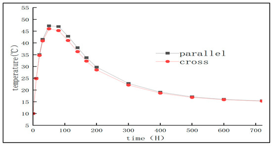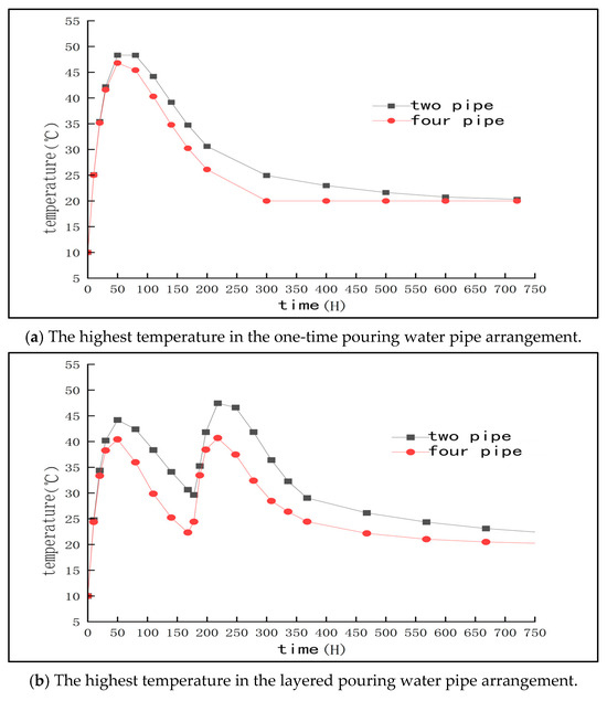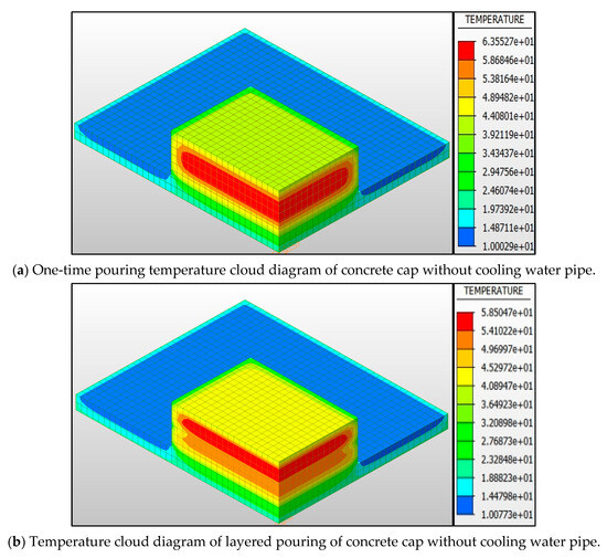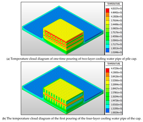Figure 4a shows the temperature field distribution of mass concrete pile cap after 720 h of pouring. Figure 4a shows the temperature cloud diagram of single pouring without a cooling water pipe. It can be seen that the temperature in the core area of concrete is concentrated, and the local maximum temperature reaches 63.55 °C. Figure 4b shows the temperature field after the layered pouring method; the temperature distribution is more uniform, the high temperature zone shrinks, and the external temperature is significantly lower than the core area. It can be seen from Figure 4a that the maximum temperature of concrete in single-layer pouring reaches 63.55 °C. This occurs under the condition of a pouring temperature of 10 °C, which exceeds the upper limit of temperature specified in ‘GB 50496-2018 Mass Concrete Construction Standard’ 3.0.4. After the layered pouring shown in Figure 4b, the peak temperature is reduced to 58.50 °C, which meets the specified requirement of ≤50 °C. Therefore, the layered pouring method is selected to control the hydration heat [22]. However, in order to make the project meet the ‘national quality project’ standard, the temperature rise still needs to be further controlled, keeping it within ≤40 °C.