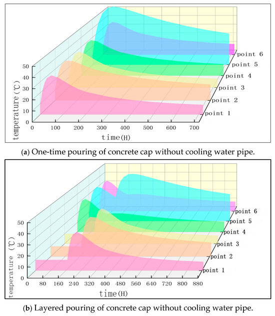 Figure 6 reveals the temperature evolution law of mass concrete pile cap under single pouring (Figure 6a) and layered pouring conditions (Figure 6b). Both of the two conditions show the three-stage characteristics of ‘rapid heating–peak platform–slow cooling’, but the temperature distribution and the degree of heat accumulation in the core area are significantly different. Specifically: