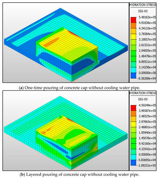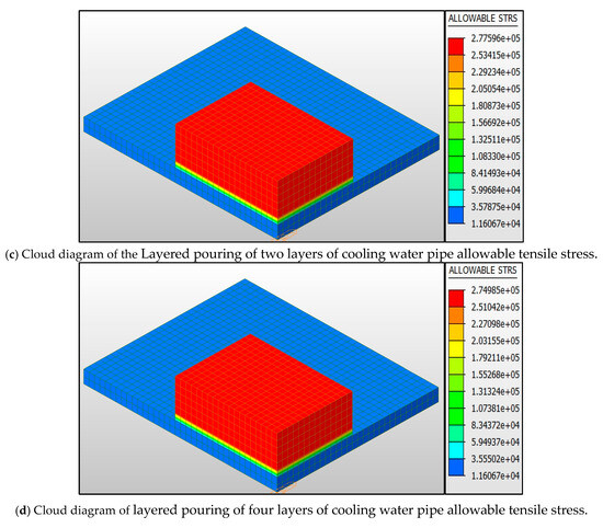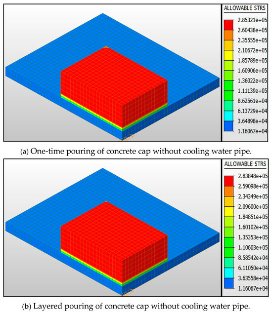 This study is based on the material properties of C40 concrete, and its 28-day tensile strength standard value is 2.39 MPa (according to GB50010-2010 [24]). Considering the temporary load combination coefficient 1.6 and the material partial coefficient 1.45 during the construction period, the basic allowable tensile stress σallow = 2.39/(1.45 × 1.6) = 1.65 MPa is calculated. For the single pouring condition, the early strength reduction coefficient is superimposed to be 0.62 (3d strength development), and the final allowable value is corrected to be 2.64 MPa. Due to the interface effect of construction joints, the interface strength reduction factor of 0.63 is adopted in the layered pouring condition, and the allowable value is adjusted to 1.66 MPa.
