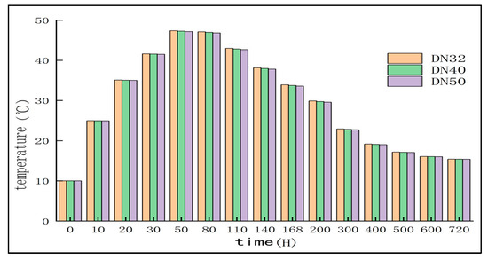 Select the measuring point A5 [30] as the analysis point. The cooling water inflow temperature is set to 15 °C [31], the flow rate is set to 1.2 m3/h, and the diameter of the cooling water pipe is set to DN32, DN40, and DN50; the convection coefficient corresponding to different pipe diameters is shown in Table 3. Bring this coefficient into the finite element software Midas Civil for simulation and obtain the temperature change diagram of the measuring point A5 under different pipe diameters, as shown in Figure 9.