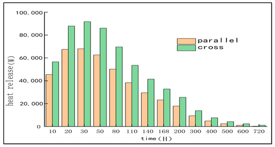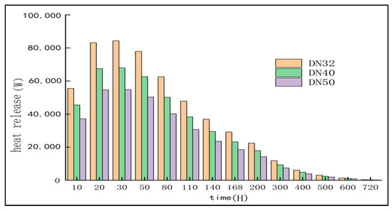 The heat dissipation of the cooling water pipe device with three different pipe diameters is compared. It can be seen from Table 4 and Figure 10 that the heat dissipation is large in DN32. The temperature comparison shows that the larger the pipe diameter is, the better the temperature control effect is, but the change of the pipe diameter is not particularly obvious for the concrete cooling effect. Therefore, it is not necessary to excessively pursue the increase of the pipe diameter of the cooling water pipe. Considering the cost-effectiveness, it is more appropriate to choose the DN40 cooling water pipe.