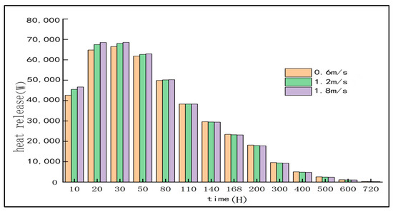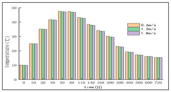 In order to study the influence of different water flow rates on the temperature distribution of the pile cap when the cooling water pipe is flowing through the water under the premise that other conditions remain unchanged, three flow rates of 0.6 m/s, 1.2 m/s and 1.8 m/s were selected, and the corresponding convective heat transfer coefficients were calculated (see Table 5) [32]. These parameters are substituted into the finite element software for calculation, and the temperature change curve of A5 measuring point under different flow velocity conditions is obtained by simulation (as shown in Figure 11).