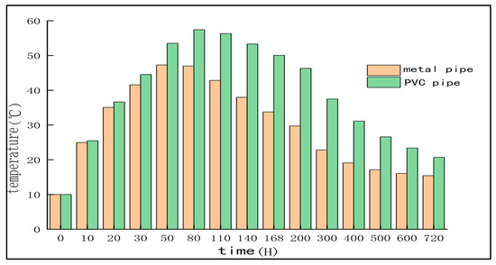 The bar chart of Figure 9 shows that, when all conditions other than the diameter of the cooling water pipe are the same, the following phenomenon becomes visible: the larger the diameter of the cooling water pipe, the lower the hydration heat temperature of the concrete at the A5 measuring point. The three diameter cooling water pipes all reached the highest temperature after 50 h. At this time point, the peak hydration heat temperature of the DN50 cooling water pipe only decreased by 1.19% compared with that of DN25 cooling water pipe. With the passage of time, the cooling water pipes of DN25, DN40, and DN50 had little difference in cooling speed.