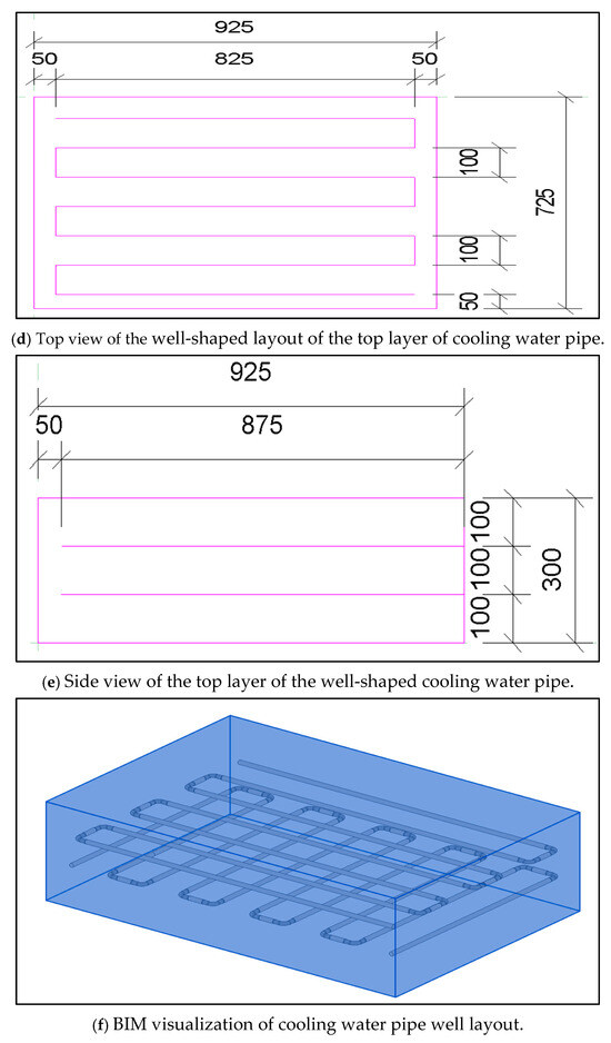 - Through the research on the selection of cooling water pipe in the cooling water pipe device, it is found that the most suitable arrangement is the parallel arrangement of DN40 water pipe, a flow rate of 1.2 m/s, and heat dissipation of 3.448 × 105 W. This study not only elucidates the theoretical mechanism by which layered casting and cooling water pipe arrangements affect the temperature and stress fields, but also confirms the practical effectiveness of the optimized strategy in the construction of mass concrete in extremely cold regions. The proposed approach has already been successfully implemented in the Dehui City Rotating Bridge project. In the future, the temperature control system introduced herein can be further expanded to other high-performance infrastructure projects, providing a robust technical foundation for enhancing the durability and safety of concrete structures.