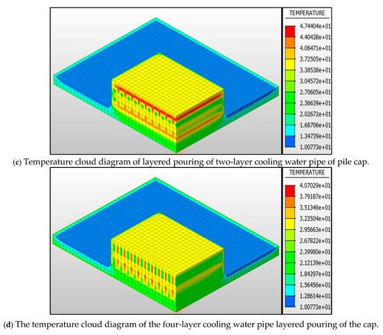 In this study, the hydration heat during the construction of the pile cap was simulated and analyzed by modifying the scheme of layered pouring, with or without a cooling water pipe and cooling water pipe arrangement. Under the premise of constant concrete material characteristics, initial temperature, time and boundary conditions, the layered pouring method was adopted, and the pouring height of each layer was 1.5 m.