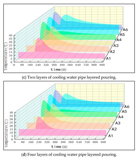 In order to discuss the variation of the stress of the center and surface joints of the pile cap with time, pouring method, and the number of layers of different cooling water pipes in more detail, the stress curves of A1, A2, A4, and A5 joints are drawn from Figure 28, Figure 29, Figure 30 and Figure 31. It can be observed from the figure that the surface stress of the cap is generally higher than the internal center area. At the same time, when layered pouring is adopted and four layers of cooling water pipes are set, the stress fluctuation of each observation point is more stable. Compared with other schemes, the fluctuation of tensile stress is smaller, and it is more difficult for cracks to form.