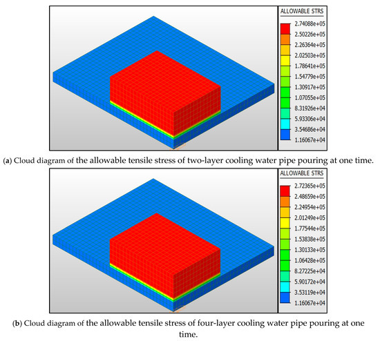 Through the analysis of finite element software (Figure 23), the allowable tensile stress of scheme 1 to scheme 4 was found to be 2.74 MPa, 2.72 MPa, 2.76 MPa, and 2.75 MPa, respectively. It is worth noting that scheme 3 allows the highest stress value but the phenomenon of over-limit occurs, which is closely related to the spatial distribution characteristics of the maximum tensile stress. Through the analysis of the stress cloud diagram in Figure 24, Figure 25, Figure 26 and Figure 27, it is found that the maximum tensile stress (2.99 MPa) of scheme 1 in the heating stage of concrete is concentrated in the central area of the top surface, and the temperature gradient at this position reaches 12.5 °C/m, forming an obvious three-dimensional constraint effect. The maximum stress (2.06 MPa) of scheme 2 is transferred to the edge of the bottom plate, which is significantly constrained by the foundation, but the stress value is reduced by 24.4% through the arrangement of double-layer cooling pipes. Although the allowable stress of scheme 3 is higher, the butterfly-shaped stress concentration zone (maximum 2.85 MPa) is formed in the core area due to the single-layer cooling pipe, and the stress development shows obvious time-varying characteristics, reaching the peak value at 72 h after pouring. In scheme 4, the maximum stress (2.28 MPa) is distributed in the middle construction joint area through the synergistic effect of four-layer cooling pipe and three-layer pouring, and the stress non-uniformity coefficient along the thickness direction is reduced from 0.67 to 0.38 in scheme 1.