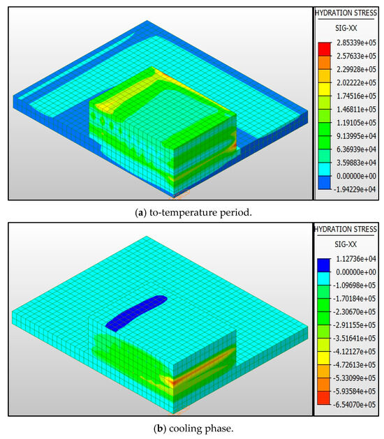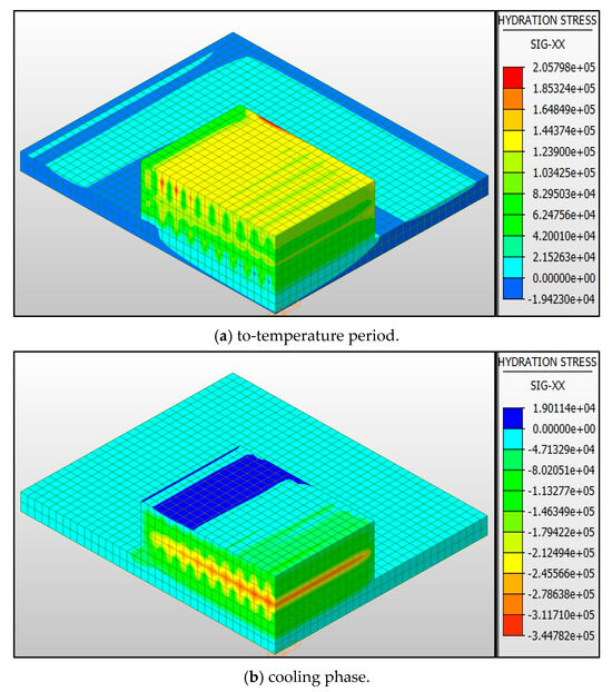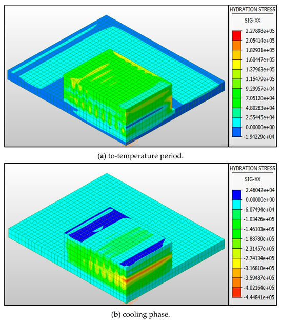The analysis results reveal that the maximum tensile stress appears on the outer surface of the mass concrete of the pile cap, while the compressive stress is mainly concentrated in the middle and lower parts of the pile cap. This stress distribution phenomenon is mainly due to the heat generated during the hydration process inside the concrete, which causes the temperature to rise, resulting in internal volume expansion. When the inner concrete is trying to expand due to thermal expansion, the outer surface concrete is subjected to tensile stress due to the restriction of the internal expansion force.