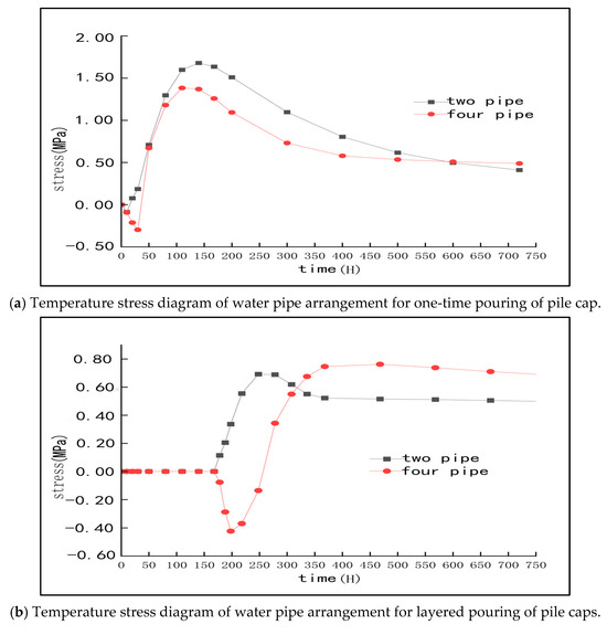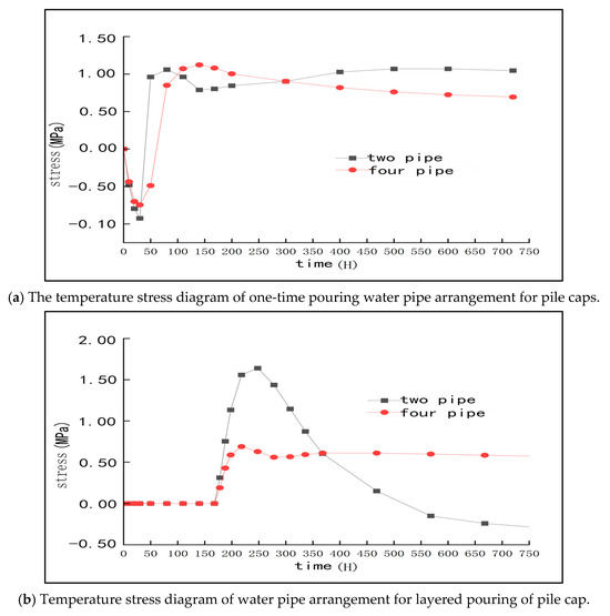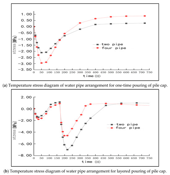 Specifically, under this scheme, the stress of the cap tends to be stable after 350 h of pouring, and the fluctuation range is also small. In general, the arrangement of four layers of cooling water pipes can ensure that the stress caused by temperature change inside the pile cap is always within the specified safe range, and the surface temperature stress is effectively controlled within 350 h. The change trend is consistent with the temperature change, which is in line with the conventional engineering law. This also suggests that, after the completion of concrete pouring, appropriate thermal insulation measures still need to be taken to maintain the quality of concrete and reduce the possibility of crack formation.