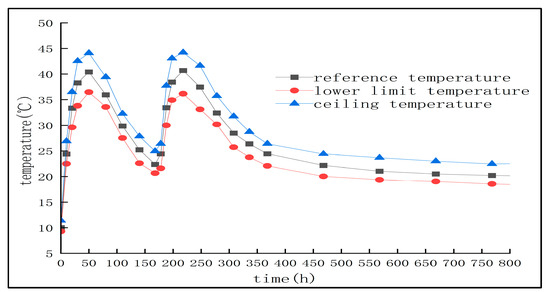 In order to verify the stability of the temperature control strategy proposed in this study under the fluctuation of actual construction conditions, we performed a ±10% perturbation analysis on the key parameters (such as concrete thermal conductivity and convective heat transfer coefficient) in the numerical model. Combined with the temperature data obtained from the simulation, we use the conventional sensitivity analysis method to determine the temperature peak. The results show that the peak temperature of the concrete core is about 40.7 °C at the DN40 pipeline, the flow rate is 1.2 m/s, and the error range is ±5%. The 720 h temperature curve is shown in Figure 33. This shows that, even if there is a certain deviation in the external environment temperature or material properties, the scheme still has good temperature control effect and robustness.