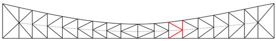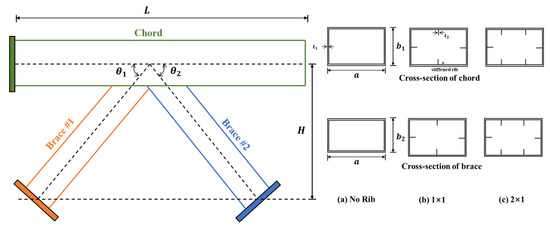 The nodes used for the experiments refer to the truss structure of the Luoxizhou Bridge located in Ganzhou City, Jiangxi Province, China. The specific dimensions of the test specimens were determined based on the Z16 joints therein (shown in Figure 1), where the dimensions of the chords and the braces were scaled down by a factor of 10 from the original project. The geometric model of the built-in stiffening rib lap-type asymmetric K-shaped square tubular joint is shown in Figure 2.