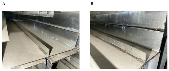 A total of five lap-type asymmetric K-shaped joints were subjected to axial compression tests. One is an unreinforced joint with a specimen labeled K-0, and the remaining four have built-in stiffening ribs. Specimens with built-in reinforcing ribs can be divided into two groups depending on the number of rib arrangements. RK-1 and RK-1F are one group, and both indicate that the tubing cross-section form is 1 × 1; RK-2 and RK-2F are another group, and both indicate that the tubing cross-section form is 2 × 1. To restore the defects of welding in the actual project and to compare and study the effect of welds on the load-carrying capacity, the reinforcing ribs of the two specimens within each group are set up with different welding methods: they are divided into full welding and partial welding. A partial weld indicates that the weld between the reinforcing rib and the tubing is interrupted, with a distance of 10 cm between welds and a single weld rod length of 4 cm (as shown in Figure 3). Due to the small thickness of the plates in the structure, all welding is CO2 shielded. The same material is used for all parts. In the label, specimens with an F at the end indicate a full weld, and those without an F indicate a partial weld.