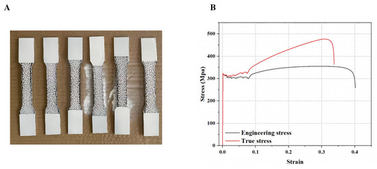 The materials used in the tests were all Q235 steel, produced in Ma’anshan, China. To obtain the material parameters of the k-joint, standard tensile specimens were manufactured according to the materials used in the experiments, and standard tensile tests were carried out on the standard tensile specimens. According to the metal tensile test specification GB/T228.1-2021 [30], the standard tensile specimen is shown in Figure 4A. To obtain the displacement changes occurring in the calibration section, a digital image correlation method was used: the surface of the specimen was sprayed with white paint, and random scattering was drawn on the calibration section. A video of the tensile process of the specimen was imported into the commercial software GOM Correlate 2018 for displacement tracking. The stress–strain curves of the materials used in the tests are shown in Figure 4B.