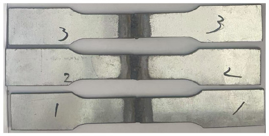 Tensile tests were performed on the strength of the welds. The same standard tensile specimen was taken and cut into two halves uniformly in the height direction. The two were then rewelded together using the same welding process used for the test. As shown in Figure 5, the weld of this specimen is a butt weld, and the thickness of the weld is the same as that of the standard tensile specimen. By testing, none of the specimens fractured at the weld.