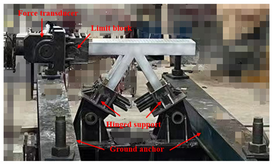 The test loading device is a JAW-1000K/2 electro-hydraulic servo structure test system produced by Hangzhou Popwil Instrument Co., Ltd., produced in Hangzhou, China. The device has a stroke of 0–300 mm and an ultimate loading force of 1000 KN. The test setup is shown in Figure 6. The two braces of the specimen were nested in the sleeves of the articulating supports, and the position of the braces was fixed with six bolts with limit blocks. The articulating support is fixed to the ground anchor. By applying a horizontal tensile force to the main pipe, the chord is stressed, the force is transferred to the braces, and the two braces are subjected to axial tension and pressure, respectively. The brace in tension is lapped on the brace in compression.