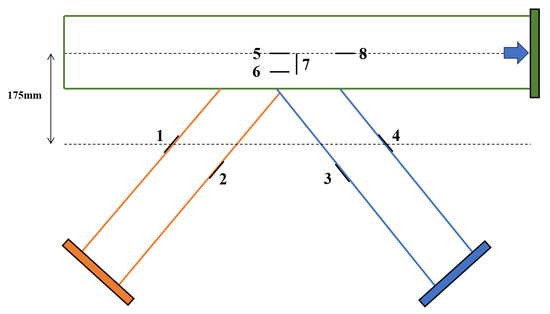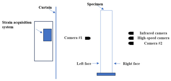 Experimental tests of axial compression of built-in stiffening rib lap-type asymmetric K-shaped square tubular joints include loading values, axial force values of the braces, and global temperature changes. Camera #1 and camera #2 were arranged on the left and right sides of the specimen to observe the experimental phenomena. Four unidirectional strain gauges, #1, #2, #3, and #4, were arranged on the brace to obtain the trend of the change in the axial force of the brace during the loading process. To obtain the deformation pattern of the chord, four unidirectional strain gauges #5, #6, #7, and #8 were arranged on the chord. The exact arrangement of the strain gauges is shown in Figure 7. The strain gauges were centrally glued to the left side of the specimen. Strain gauge model BX120-10AA used a resistance value of 120 Ω and a sensitivity factor of 2.08%. To obtain the global deformation pattern and also to compare the values of the reference strain gauges, a random scattering image was plotted on the right surface of the specimen using the numerical correlation method. The right side of the specimen was arranged with a high-speed camera in a fixed position with a recording frequency of 10 HZ. Images were imported into GOM Correlate 2018 to obtain global real-time displacement clouds and stress–strain clouds. To investigate the changes in the structure at the temperature level during the deformation process, an infrared camera was arranged on the right side of the specimen. The specific site layout is shown in Figure 8.