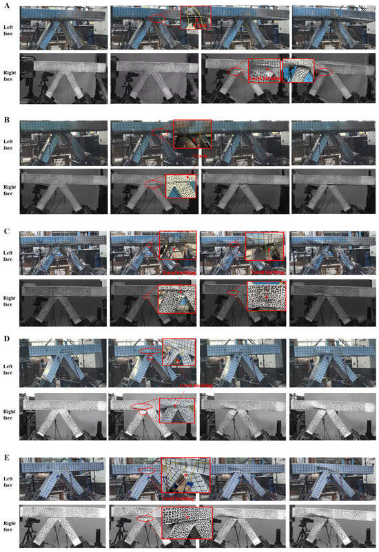 Deformation process of specimens: (A) K-0, (B) RK-1, (C) RK-1F, (D) RK-2, (E) RK-2F.