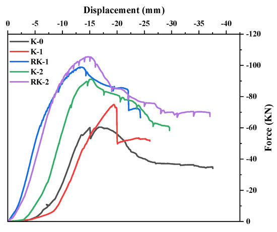 According to the above experimental phenomena, K-0 and RK-1 showed obvious cracks in the experiments, and K-1 even showed the phenomenon of main pipe rotation, while RK-1F, RK-2F, and RK-2 did not show any cracks, which indicates that transverse reinforcing ribs and more complete welds shared the extrusion of the brace on the main pipe. In RK-1, the greater range of buckling occurring in RK-2 indicates that arranging more reinforcing ribs in the fittings makes the chord more uniformly stressed and absorbs more energy while increasing the buckling load capacity of the fittings’ side plates. In contrast, the structure continued to emit a sustained phasic sound when the surface of the specimen was not showing significant changes, indicating that the sound originated from the internal reinforcing ribs. This can be inferred from the fact that the reinforcing ribs buckled before the side panels during the deformation of the structure.