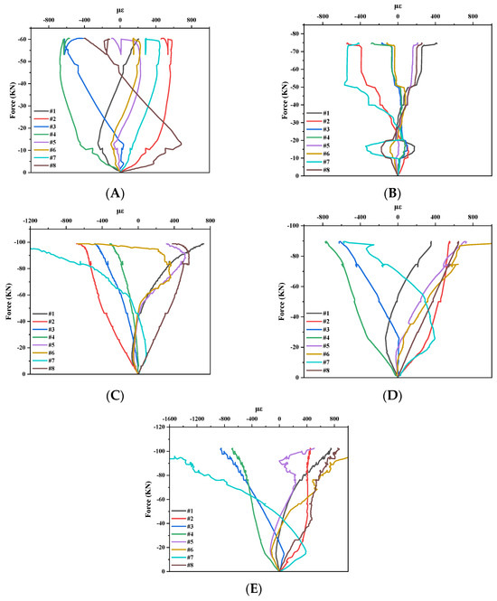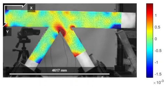Figure 11 plots a schematic of the structural strain field of K-0 acquired by the high-speed camera-based DIC system [32]. It can be seen that the region of maximum stress in the joint is concentrated in the lap region of the brace. Figure 12 plots the strain loading curve at each stress measurement point. In conjunction with the experimental phenomena of the structure, the force characteristics of the structure are derived from the trend of the strain load curve: During the elastic phase, when the structure is under tension, one of the braces is continuously under tension, and the other is continuously under pressure. The first half of the chord is dominated by the pull. As the chord is squeezed by the brace, the middle section of the chord is bent, in which the upper half of the region is tensile and the lower half is compressive. At this time, the neutralization axis of the chord is downward, so the compressive strain in the lower part of the chord is less than the tensile strain in the upper part.