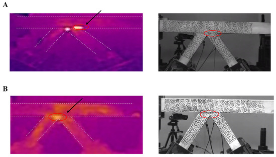 Apparent temperature changes seen with infrared cameras. (A) cracking phenomena; (B) Local buckling.