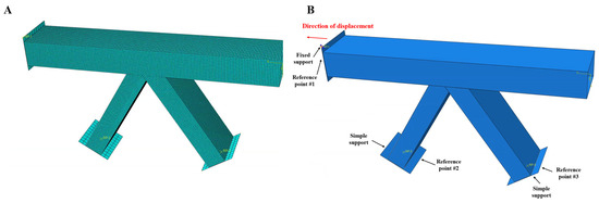 To compare and analyze the axial compression experiments of built-in stiffening rib lap-type asymmetric K-shaped square tubular joints, a finite element analysis model is created according to the finite element method. Based on the finite element software ABAQUS 6.14, the K-shaped joint structure is modeled using quadrilateral shell units (S4R). The end plates are modeled using 2D rigid body modeling (R3D4). The modeling position of the shell is defined as the midplane. The mesh delineation diagram is shown in Figure 14A, and the global mesh size is set to 5 mm. Based on the data of the standard tensile specimen in Figure 4, the ideal elastic-plastic intrinsic model with linear reinforcement is developed. According to the AISC Steel Construction Manual [34], the density of Q235 steel is set to 7850 kg/, Poisson’s ratio is 0.29, and the modulus of elasticity is .