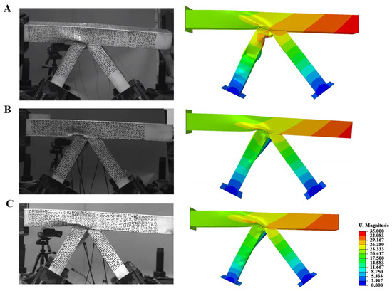 Comparison of the deformation pattern of the specimen at the final moment (left) with the displacement cloud of the finite element model (right). (A) No rib, (B) ribs, (C) ribs.