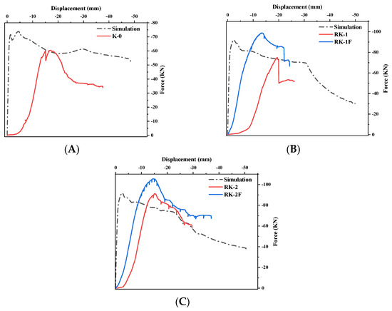 Comparison of experimental and simulated load-displacement curves. (A) K-0; (B) K-1 and RK-1; (C) K-2 and RK-2.