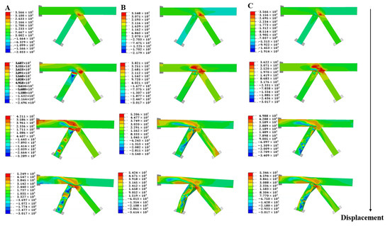 Figure 17 plots the first principal stress cloud for each finite element model at different moments of deformation. According to Figure 17, at the moment , the individual models experienced a stress concentration at the junction of the pressure brace and the chord. The location where the stress concentration occurs is likewise the location where the K-0 experimental model produces cracks. At the moment , the model without reinforcement ribs buckled at the top of the pressure brace, while the model with reinforcement ribs buckled in the region of its neighboring chord. At the moment , the side panels of the chord without ribs buckled, while the model with ribs buckled at the lap, which is consistent with the deformation pattern of the experimental specimen. At the moment , the horizontal loading device stays flat while the brace stays rotated, resulting in a height difference between the chord and the loading device, and the pressure stub is thus bent. It is also clear that an inclined shear plane exists at the middle end of the chord, and the angle of inclination of the shear plane of the model with additional reinforcing ribs is less than that of the model without ribs. Based on the deformation pattern of the finite elements described above, the addition of the reinforcing ribs resulted in a change in the deformation pattern of the model: the unribbed model flexes first in the brace and later in the chord under tension in the main tube, whereas the ribbed model first experiences flexion at the location of the chord, and flexion occurs after the brace. The difference occurs because the flexural bearing capacity of the additional reinforced ribbed brace is greater than the bearing capacity of the side plate in flexure.